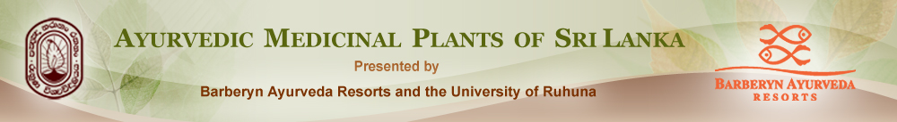 Barberyn Ayurveda Resorts with its Institute of Ayurveda and Alternative Medicine, have, in conjunction with the University of Ruhuna, Department of Botany, enabled this ‘Ayurvedic Medicinal Plant Website’. It contains scientific details of the most commonly used Ayurvedic Medicinal plants of Sri Lanka. Its purpose is to disseminate this information to the Ayurveda medical profession, the academia, students of Ayurveda and Botany, as well as the general public.